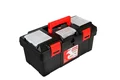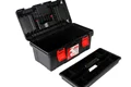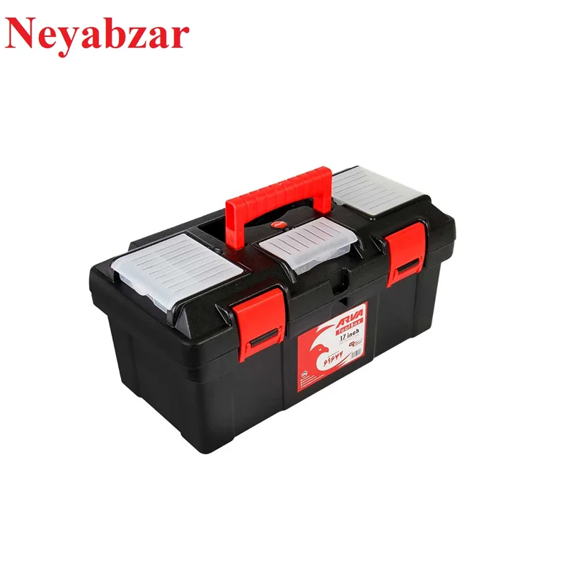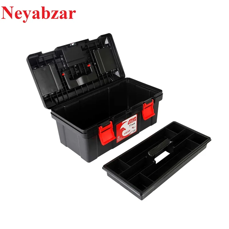 ساخت ایران مجهز به دسته ی پلاستیکی بسیار مقاوم طراحی ارگونومیک و به منظور داشتن فضای بیشترمجهز به دو قفل پلاستیکی محکم دارای سه محفظه ی درب دار به منظور نگهداری پیچ، مهره و مته تولید شده از مواد بسیار عالی و با دوام